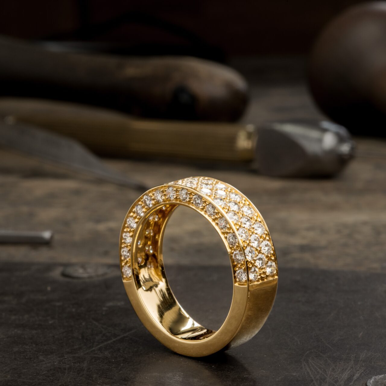 Um clássico da joalharia onde o brilho dos diamantes é realçado com a cravação “Pavê”.