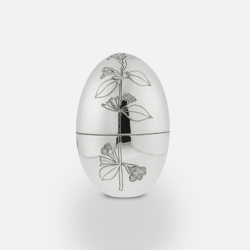 Pequenas flores de cidreira delicadamente cinzeladas na prata. Um trabalho manual e de perícia. Seja para oferecer ou para a sua coleção de ovos da Páscoa. Em prata 925, manufaturados nas oficinas Leitão & Irmão, a coleção de ovos é um best seller todo o ano. Um presente elegante, original e unisexo.